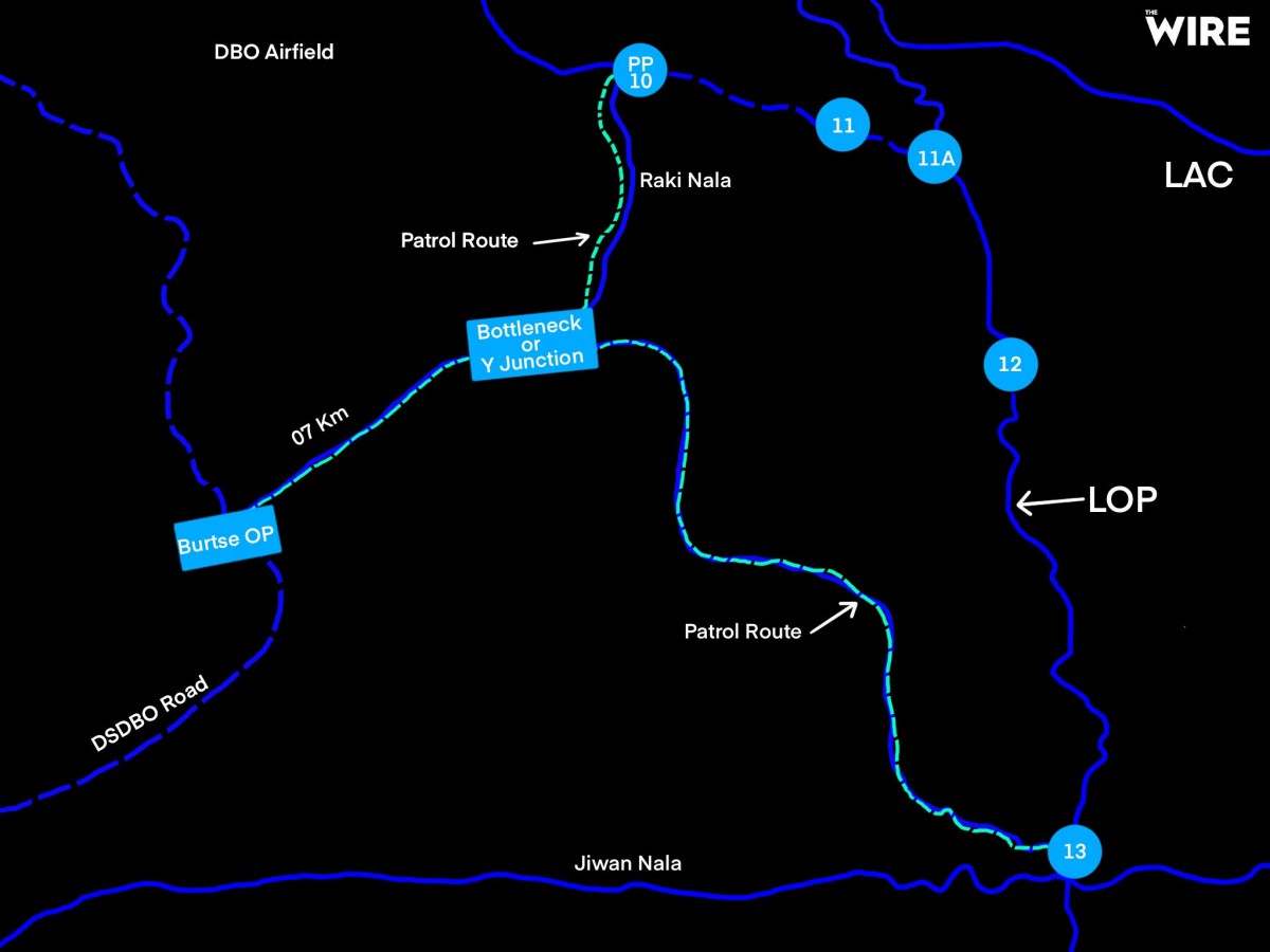 The PLA has denied the Indian Army's patrols access to five patrol points – PP 10, 11, 11a, 12 and 13 – which marked India's limit of patrol, or LOP, by blocking them at Bottleneck/Y junction around 18 km inside the LAC. Map: The Wire.