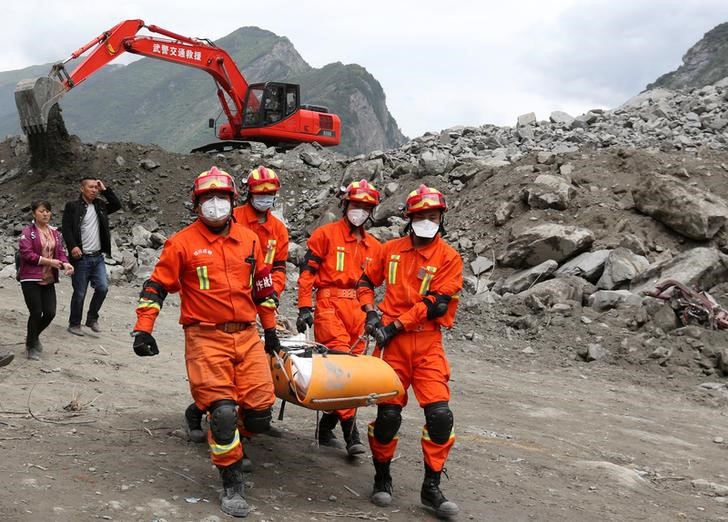 Rescue workers carry a victim at the site of a landslide that occurred in Xinmo Village, Mao County, Sichuan province, China, June 25, 2017. Credit: Reuters/China Daily