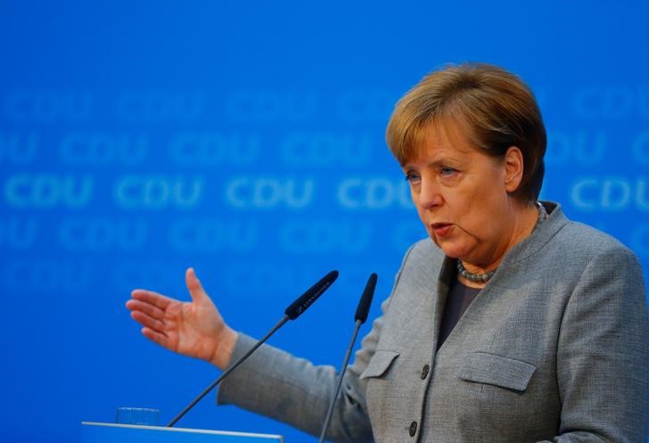 Acting German chancellor Angela Merkel address a news conference at the Christian Democratic Union (CDU) party headquarters in Berlin, Germany, December 18, 2017. Credit: Reuters/Hannibal Hanschke