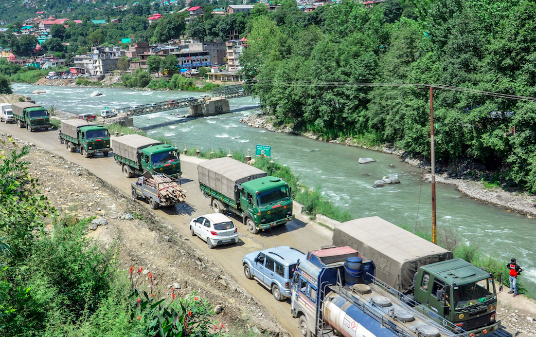 Army trucks move towards Ladakh amid LAC border tension, at Manali-Leh highway in Kullu, Friday, July 31, 2020. Photo: PTI