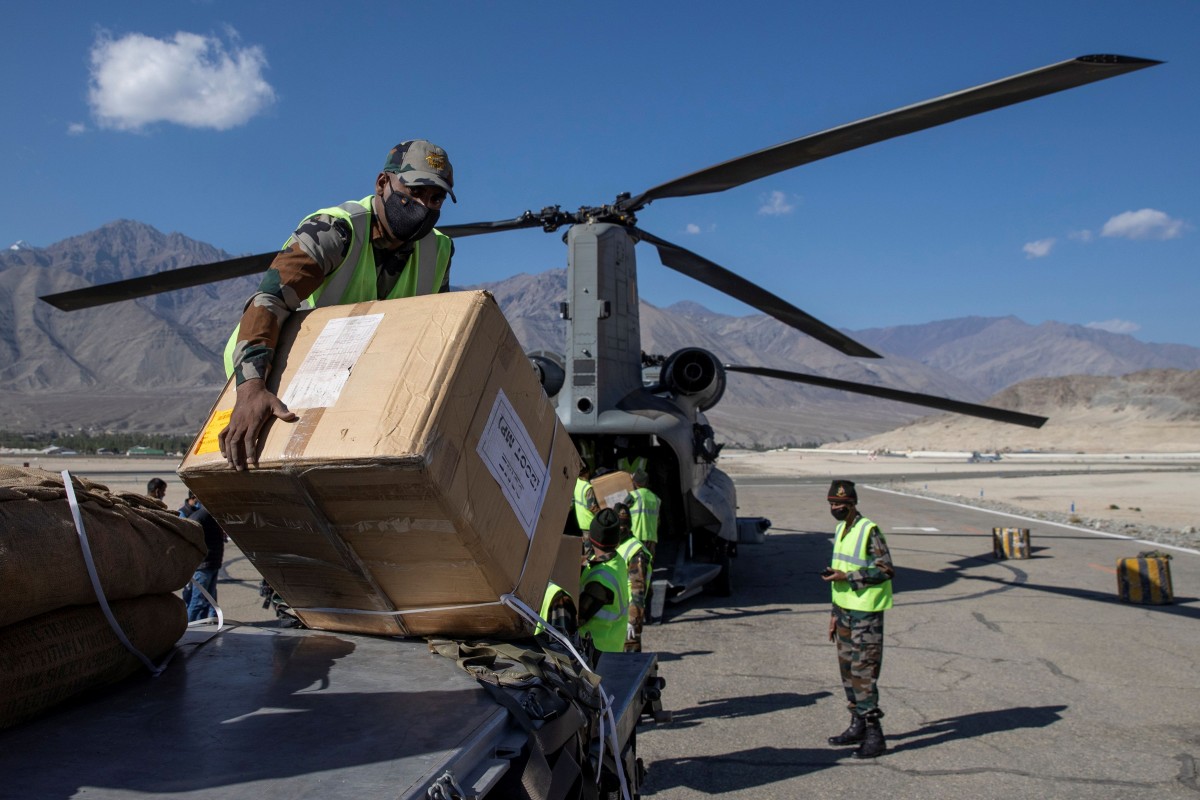 Soldiers load an Indian Air Force's Chinook helicopter with supplies at a forward airbase in Leh, in the Ladakh region, September 15, 2020. Photo: Reuters/Danish Siddiqui