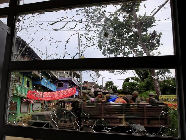 A military truck driving past an abandoned hospital is seen through its window full of bullet holes, as government troops continue their assault against the Maute group, in Marawi City, Philippines June 12, 2017. Credit: Reuters/Romeo Ranoco