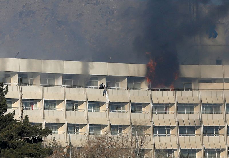 Afghan security forces keep watch as smoke rises from the Intercontinental Hotel in Kabul, Afghanistan, January 21, 2018. Credit: Reuters/Omar Sobhani