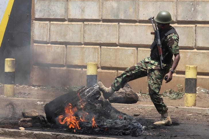 A Kenyan policeman kicks a burning tire set on fire by protesters supporting opposition leader Raila Odinga during clashes in Kisumu, Kenya August 11, 2017. Credit: Reuters/James Keyi