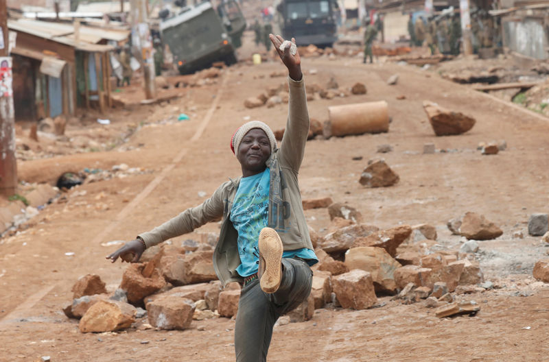 A supporter of opposition leader Raila Odinga gestures in front of a barricade in Kawangware slum in Nairobi, Kenya, August 10, 2017. Credit: Reuters/Goran Tomasevic