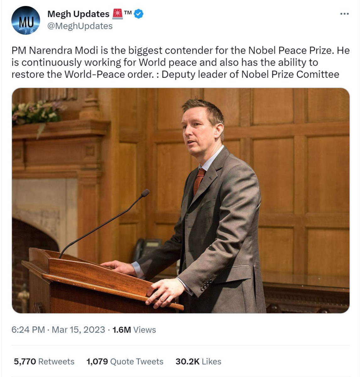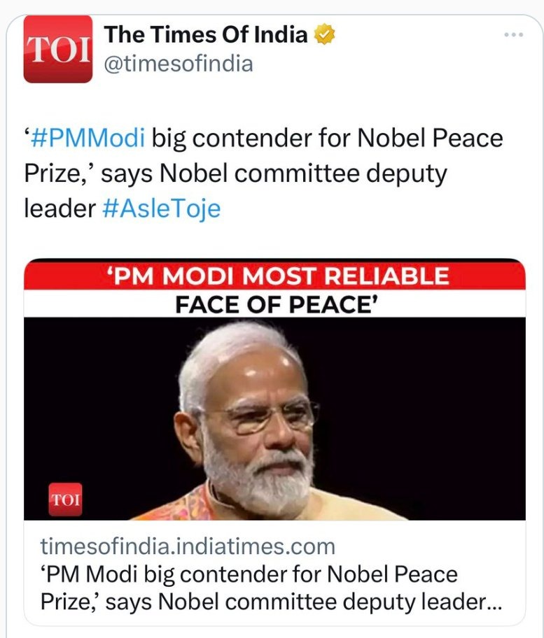 In their reportage, a Times Now anchor quoted Toje as saying that PM Modi “is the biggest contender for the Nobel Peace Prize” ahead of the 2024 elections and that he was the most reliable face of peace in the world. They further quoted him as saying that PM Modi was the most trusted leader for stopping war and “only he can establish peace”.