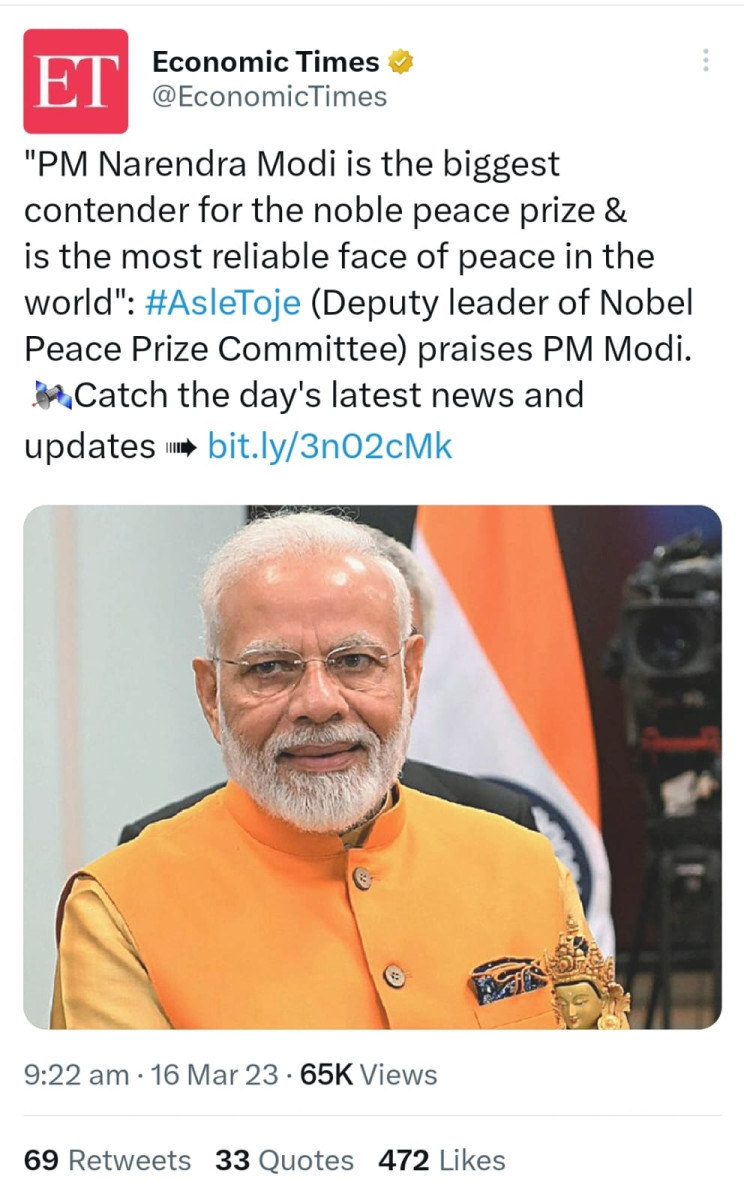 Economic Times made the same claim in multiple tweets, all of which have been deleted since. In one of the tweets, ET stated that Asle Toje had praised Narendra Modi by saying that Modi “is the most reliable face of peace in the world”. (Archives here and here)