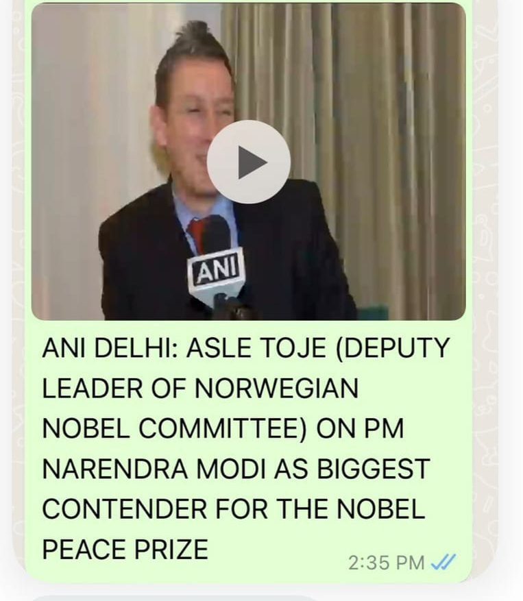 At 5:06, the reporter again asks, “As you are the deputy leader of the Nobel committee which is looking for a potential candidate for the Nobel Peace Prize, I am asking you if Prime Minister Modi can bring an end to the Russia-Ukraine war”. Toje replies, “It will not be my place to put a challenge for the Prime Minister of India. I want every leader in the world to work for peace and powerful leaders like Modi have much more chance and ability to do so. I am happy to see that he is devoting his time not only further the cause of India and to grow the strength to grow the Indian economy, but he also spends time on issues that are not so close to home but which are of interest to the global community and peace in the world.”