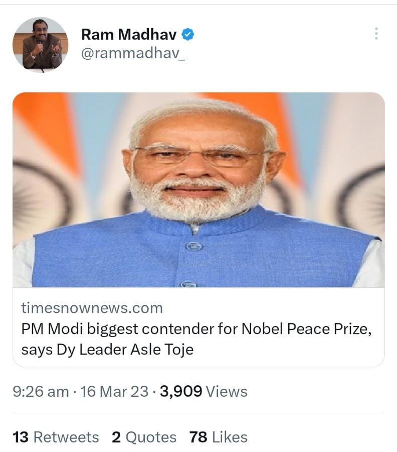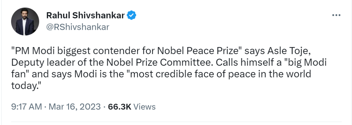 Several media outlets reported in March 2023 that the deputy leader of the Nobel Prize committee, Asle Toje, who was in India at that time, had called Prime Minister Modi the ‘biggest contender for the Nobel Peace Prize’ and the ‘most reliable face of peace’ in the world. Some went on to say that he was likely to win the prize.