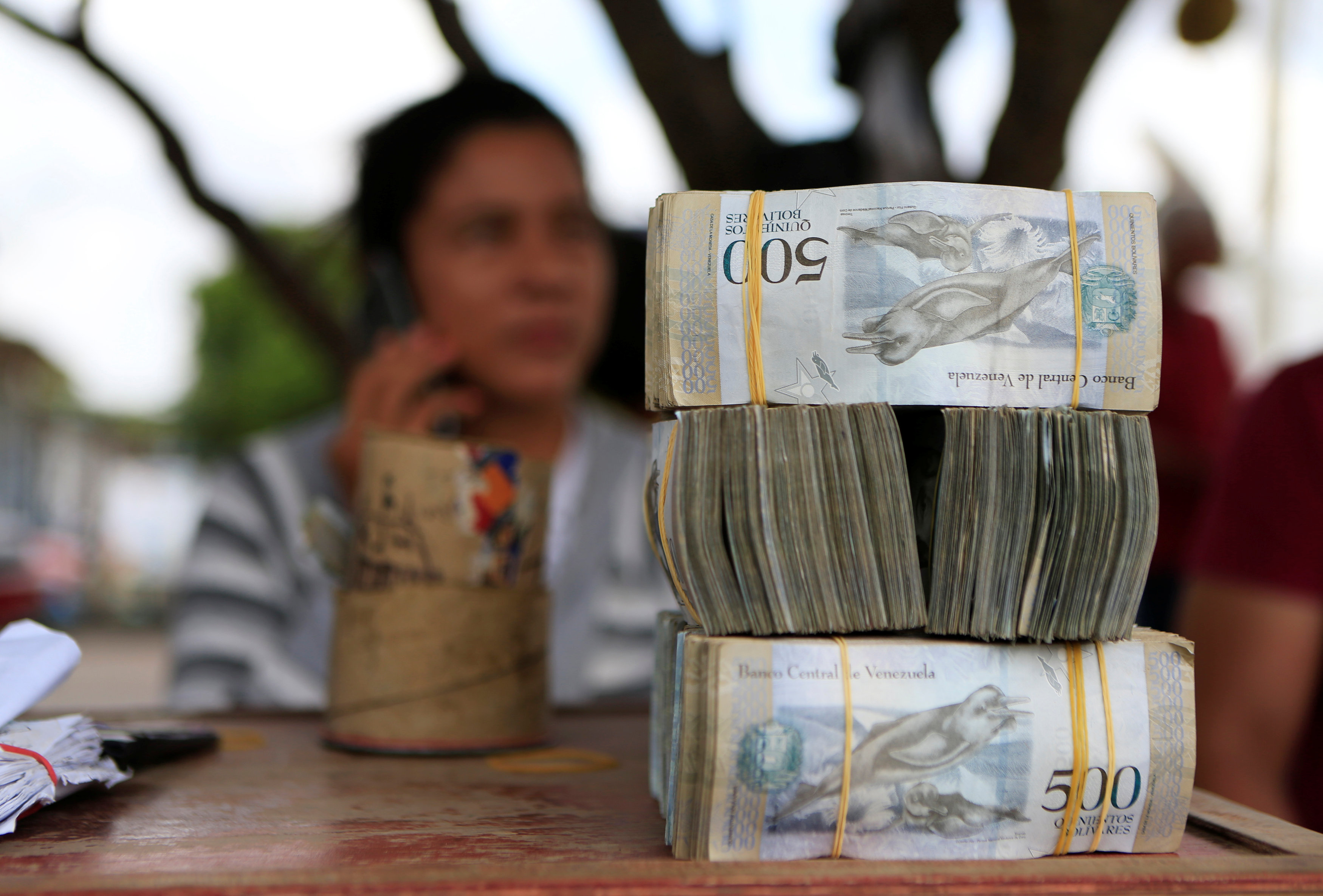 Money changers sit at tables stacked with wads of Venezuelan currency, made nearly worthless by hyperinflation under President Nicolas Maduro's socialist government.