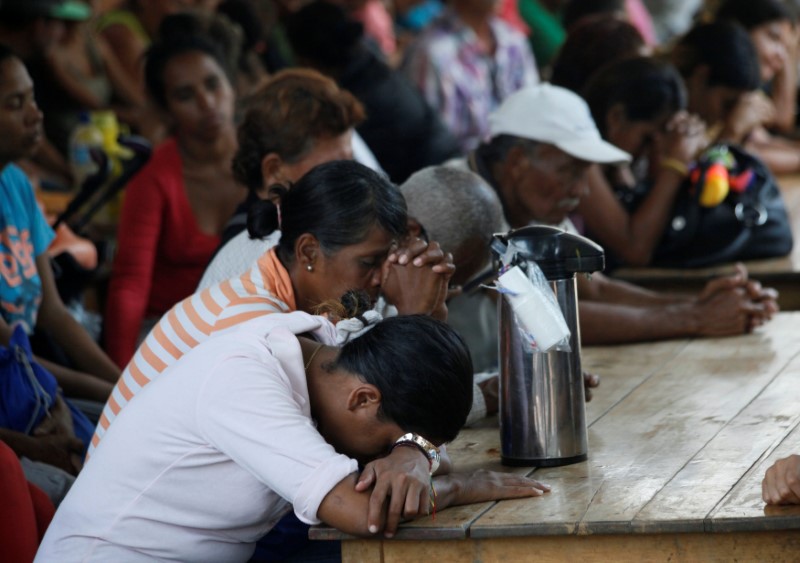 Venezuelans pray as they gather at a dining facility organised by Caritas and the Catholic church, in Cucuta, Colombia. Credit: Reuters/Carlos Eduardo Ramirez