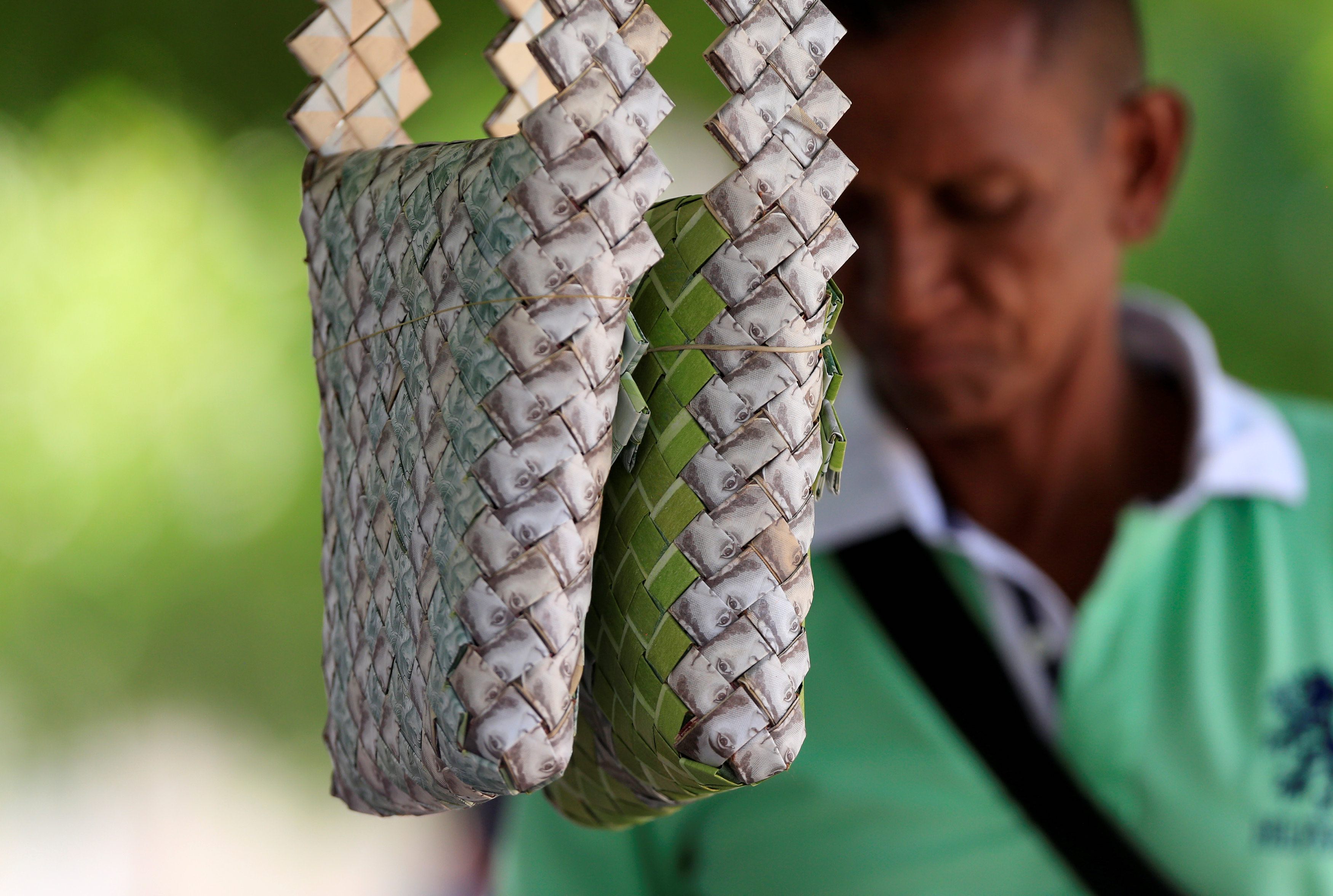 Despairing of finding work, some entrepreneurial migrants turn the nearly-worthless bolivar currency into crafts, weaving handbags from the bills and selling them in Maicao's park.