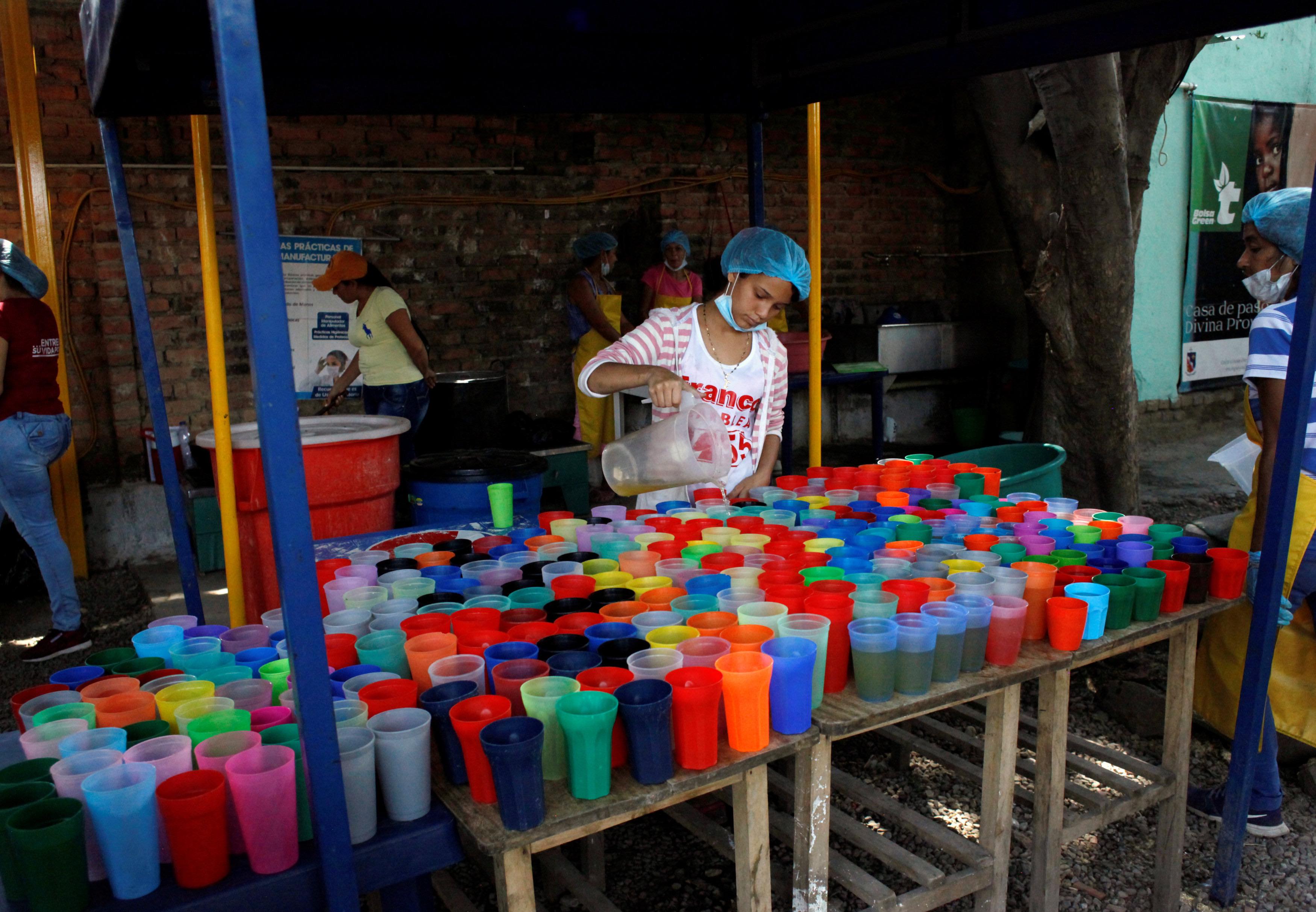 A voluntary worker fills cups with water at a dining facility organised by Caritas and the Catholic church for Venezuelans, in Cucuta, Colombia, on February 21. Credit: Reuters/Carlos Eduardo Ramirez