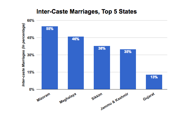 Christian-dominated Mizoram where 87% of the population is Christian – has the most inter-caste marriages in India, a nation where 95% of Indians marry within their caste, according to this 2016 report from the National Council of Applied Economic Research, a New Delhi-based think-tank.