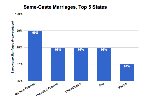 In Madhya Pradesh, almost all (99%) people were married in their own caste, followed by Himachal Pradesh and Chhattisgarh, both at 98%.