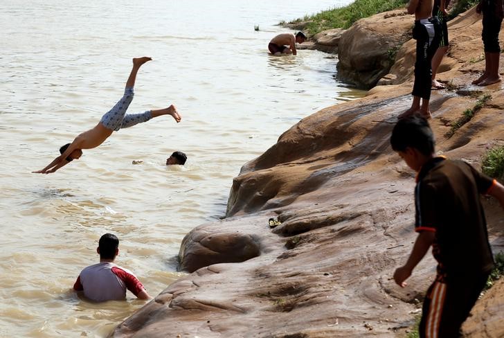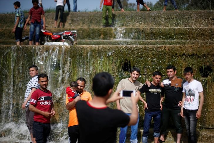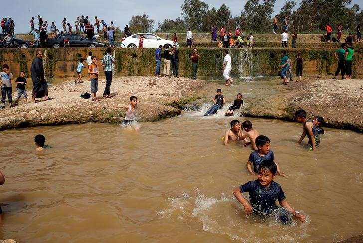 Iraqi girls play with water as they enjoy their Friday holiday with their family at Shallalat district (Arabic for "waterfalls") in eastern Mosul, Iraq, April 21, 2017. Credit: Reuters/ Muhammad Hamed
