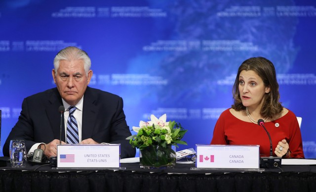 US Secretary of State Rex Tillerson speaks with Canada’s Minister of Foreign Affairs Chrystia Freeland during the Foreign Ministers’ Meeting on Security and Stability on the Korean Peninsula in Vancouver, British Columbia, Canada, January 16, 2018. Credit: Reuters/Ben Nelms