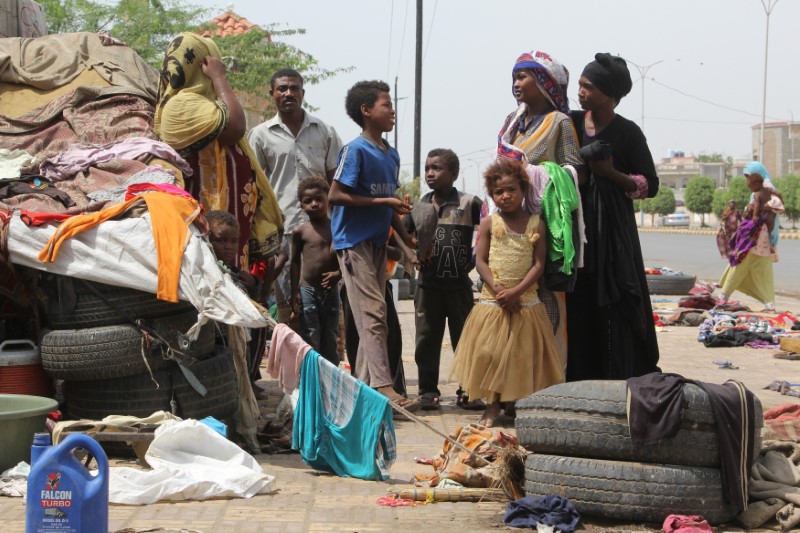 People displaced by the war in northwestern Yemen, are pictured next to their makeshift hut on the pavement of a street in the Red Sea port city of Hodeidah, Yemen May 15, 2017. Picture taken May 15, 2017. Credit: Reuters/Abduljabbar Zeyad