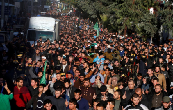 Mourners and Palestinian Hamas militants take part in the funeral of their comrade, who was killed in an Israeli airstrike, in Gaza City December 9, 2017. Credit: Reuters/Mohammed Salem