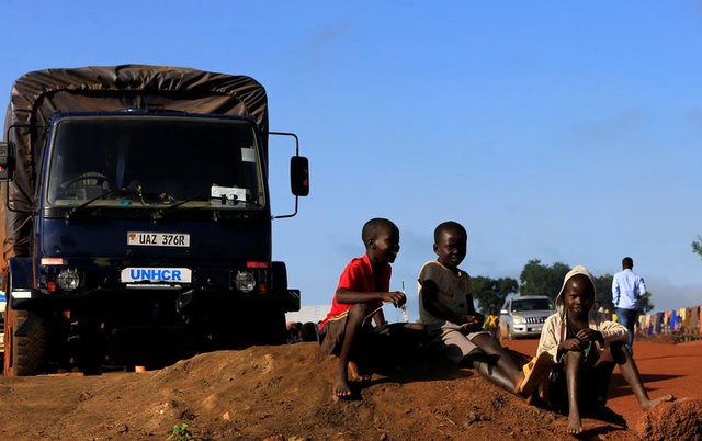 Children displaced by war in South Sudan play by a United Nations High Commissioner for Refugees (UNHCR) truck at the Palabek Refugee Settlement Camp in Lamwo district, Uganda, June 16, 2017. Credit: Reuters/James Akena