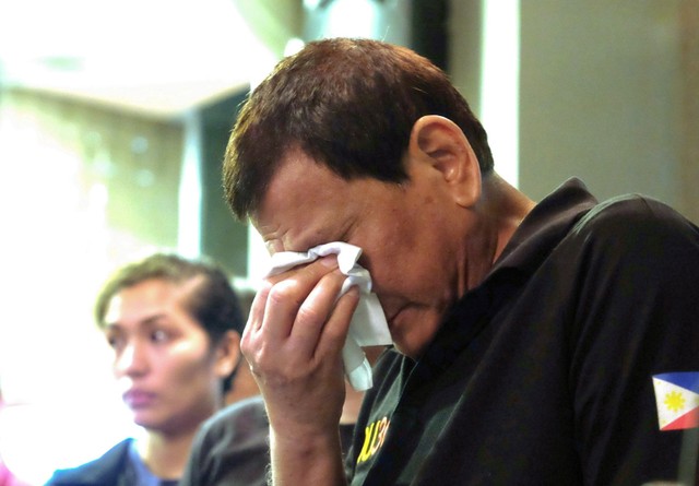 President Rodrigo Duterte weeps as he comforts family members of fire victims in Davao city in Philippines, December 24, 2017. Credit: Reuters/Presidential Palace
