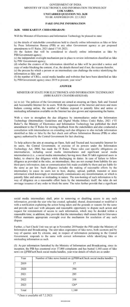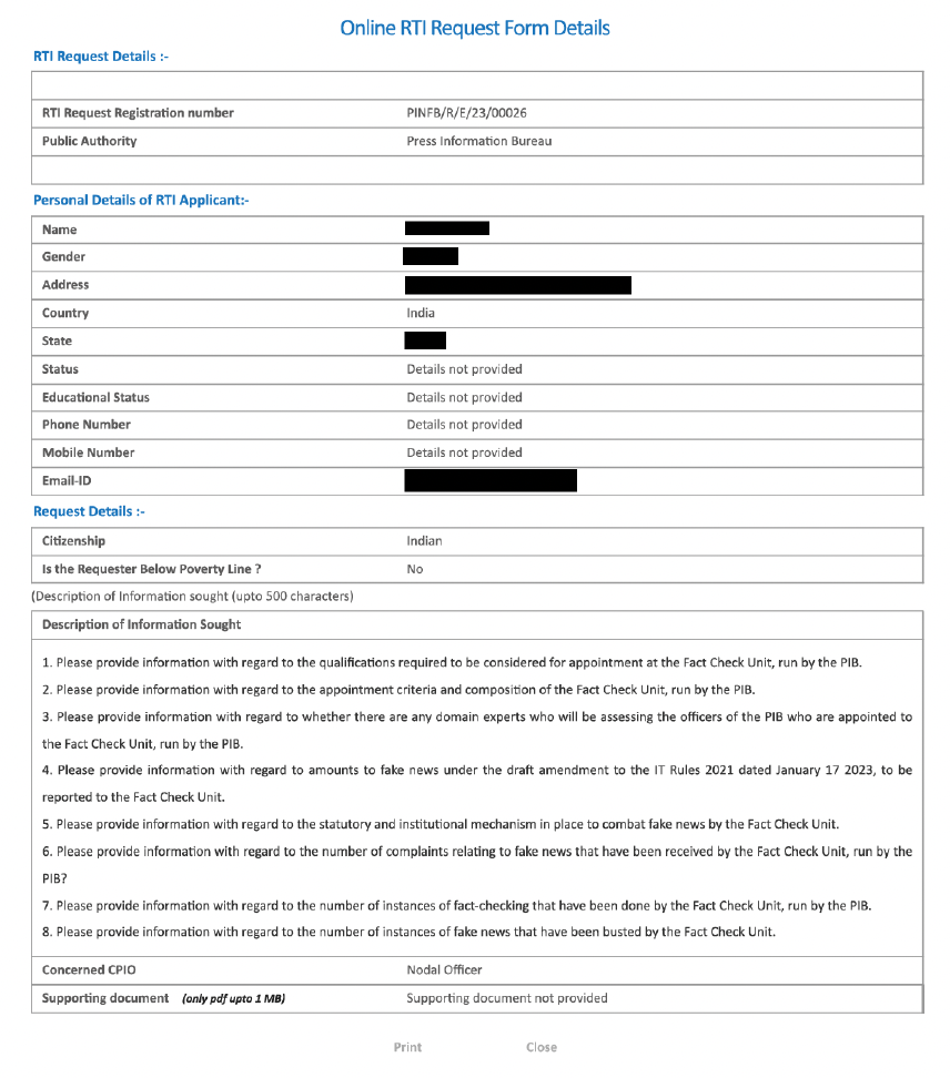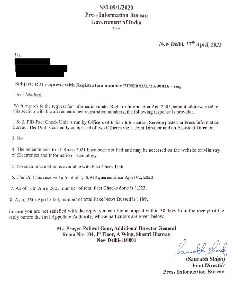 On April 20, 2023, The Wire published an article based on a Right to Information (RTI) application filed by the Internet Freedom Foundation, which asked eight questions, relating mainly to the composition of the Press Information Bureau’s (PIB) fact-check unit, as well the numbers of cases of fact-checking that were reported to the PIB, acted upon by the PIB and “busted” by the PIB.