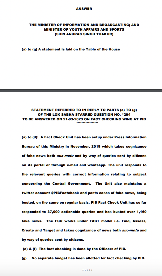 This information was not provided in PIB’s RTI response. Nevertheless, the article accounted for a lower number of queries being actionable, as a way to explain why the PIB has self-admittedly only done 1,223 fact checks. In fact, our article relied on data provided in a recent parliamentary response by the Union minister of information and broadcasting, in which he stated that the actionable queries received were 37,000.