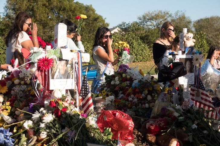 Well-wishers place mementos the day students and parents arrive for voluntary campus orientation at Marjory Stoneman Douglas High School. Credit: Reuters/Angel Valentin