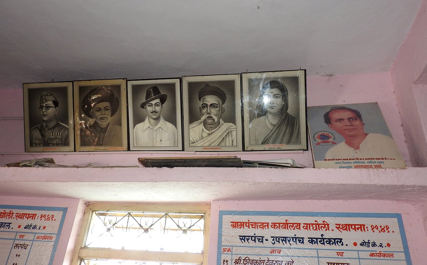 The photo of Annabhau Sathe (extreme right), social reformer from the Mang community, found a place in the panchayat office alongside photographs of Subhash Chandra Bose, Jyotiba Phule, Bhagat Singh, Lokmanya Tilak and Savitribai Phule. Credit: Namita Waikar
