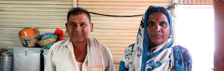 Shalubai with her husband Rajendra Kasbe inside their tin-sheet home; her older sister looks on. Credit: Namita Waikar