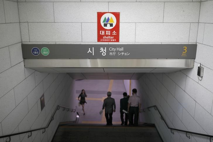 A sign of shelter is seen at an entrance of a subway station in Seoul, South Korea, August 11, 2017. Credit: Reuters/Kim Hong-Ji