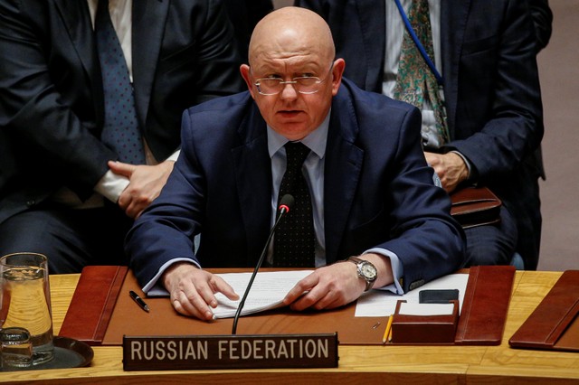Russian Ambassador to the United Nations Vasily Nebenzya addresses the United Nations Security Council about an international inquiry into chemical weapons attacks in Syria, during a meeting at the United Nations headquarters in New York, US, November 17, 2017. Credit: Reuters/Brendan McDermid