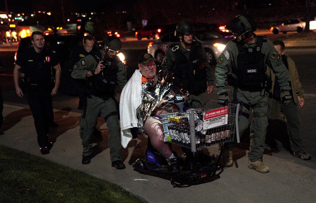 Patrick Carnes is evacuated in a Walmart cart by SWAT medics from the scene of a shooting at a Walmart where Carnes was shopping in Thornton, Colorado November 1, 2017. Credit: Reuters/Rick Wilking