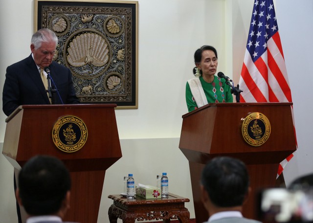 Myanmar's State Counselor Aung San Suu Kyi and U.S. Secretary of State Rex Tillerson attend a press conference at Naypyitaw, Myanmar November 15, 2015. REUTERS/Aye Win Myint
