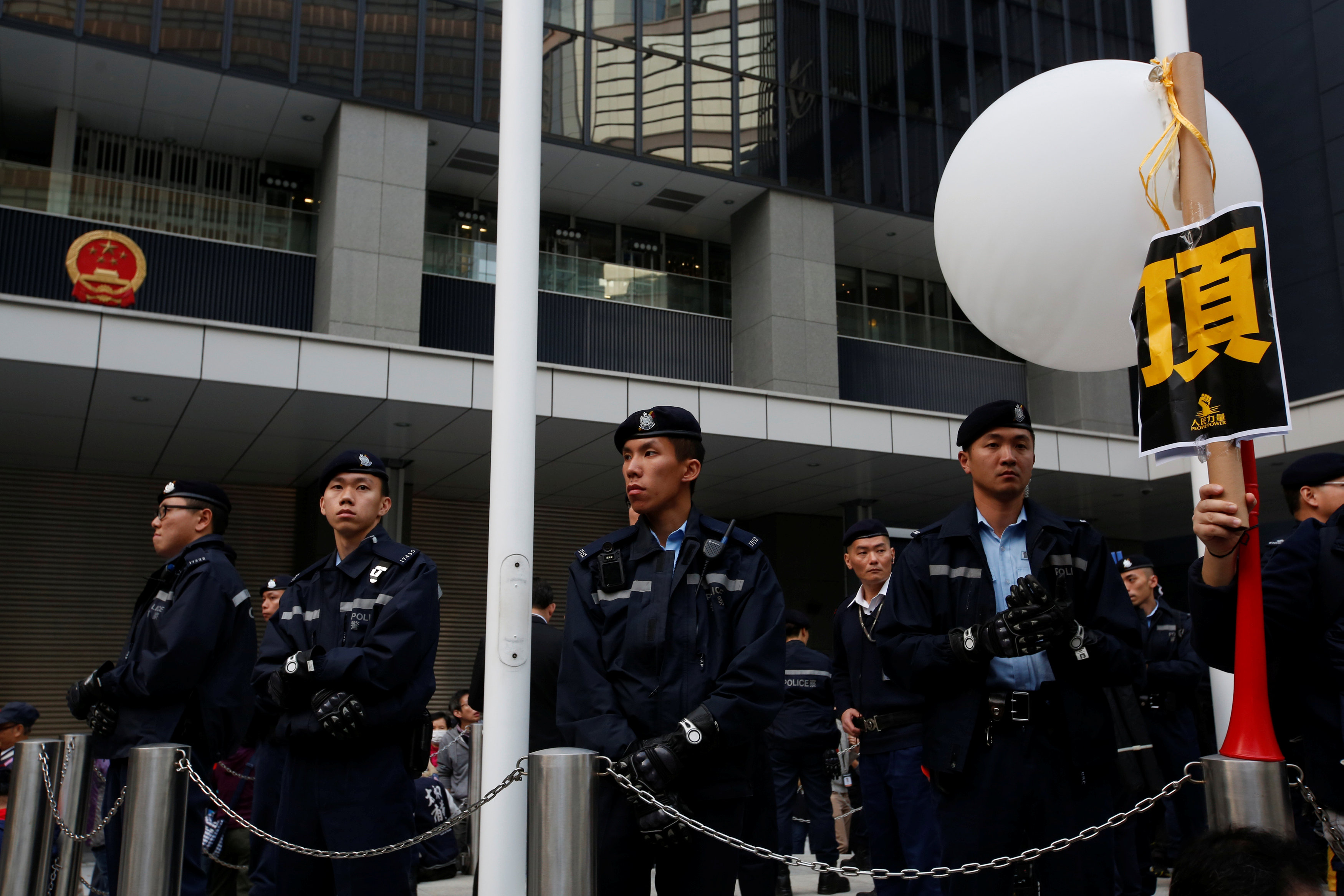Policemen guard on a podium inside civic square, reopened for the first time for protests since Occupy Central movement in 2014, at the government headquarters in Hong Kong, China January 1, 2018. REUTERS/Bobby Yip