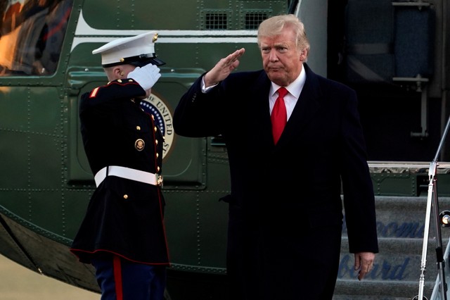 US President Donald Trump salutes on South Lawn upon his return to the White House in Washington from Pittsburgh, US, January 18, 2018. Credit: Reuters/Yuri Gripas