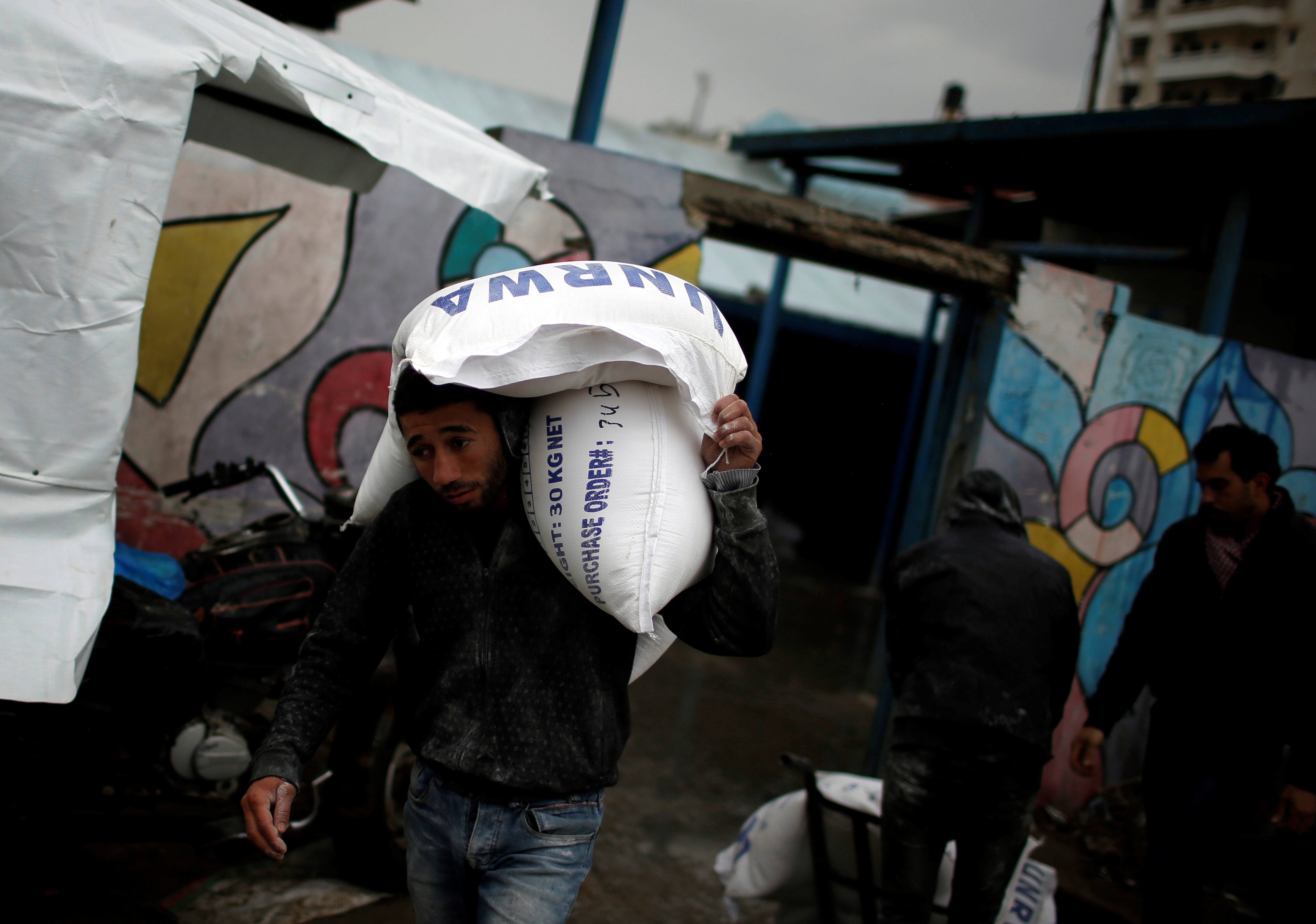 A Palestinian man carries sacks of flour outside a UN food distribution center in Al-Shati refugee camp in Gaza City, January 17, 2018. Credit: Reuters/Mohammed Salem