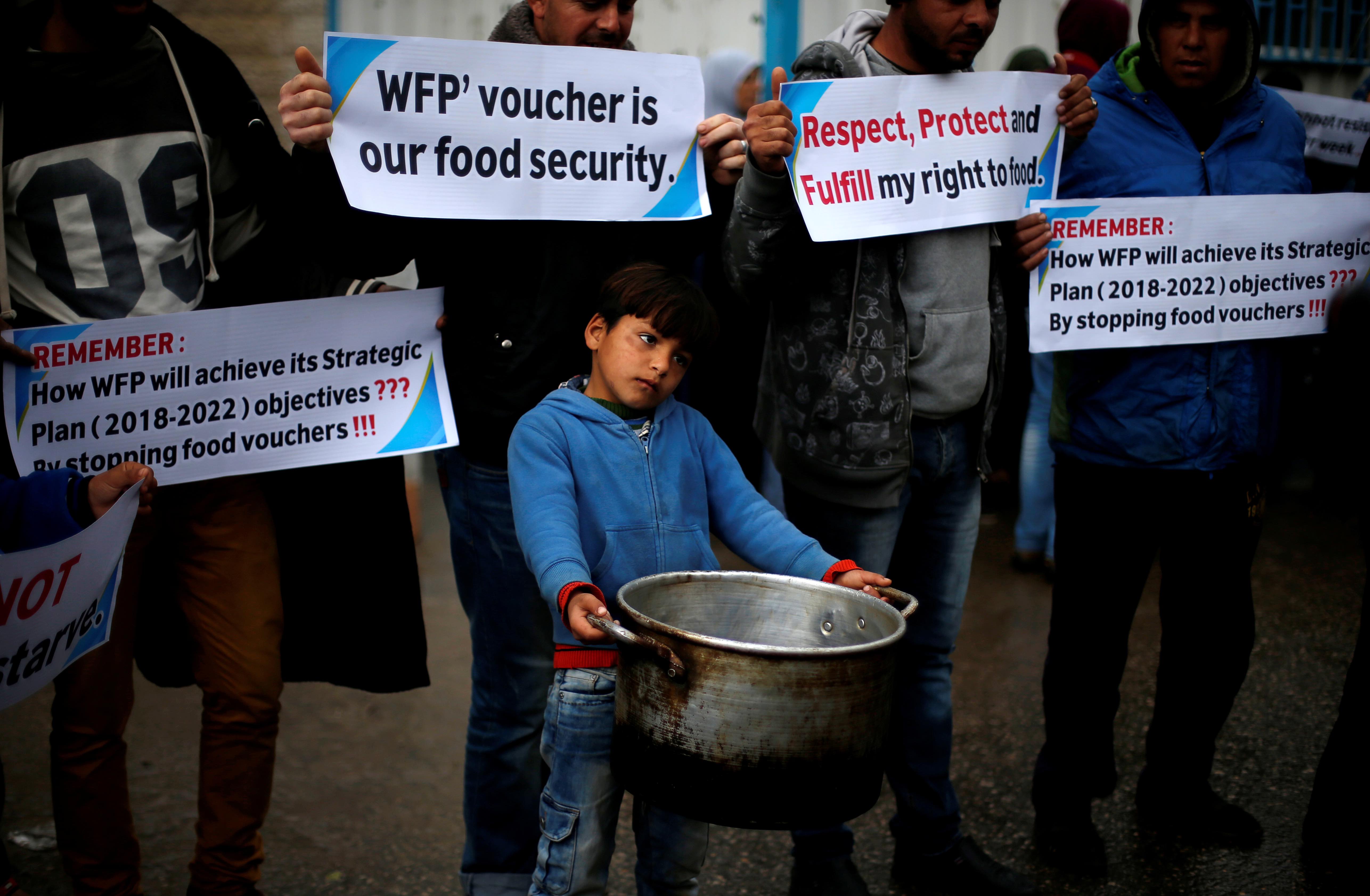 A Palestinian boy carries a cooking pot during a protest against aid cut, outside UN offices in Gaza City January 17, 2018. Credit: Reuters/Suhaib Salem