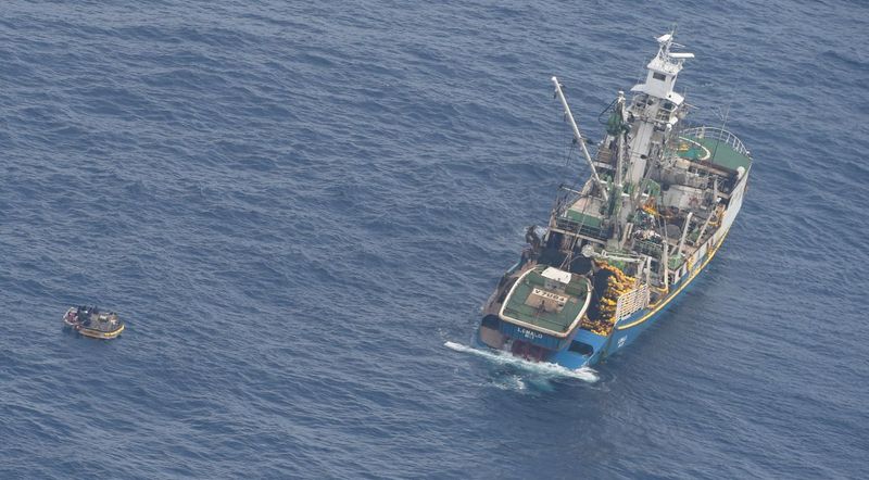 Imagery that was taken from the @NZAirForce P-3K2 Orion as the fishing vessel picked up the seven survivors from a ferry with 50 people on board that was reported missing in Kiribati a week ago. Credit: Twitter