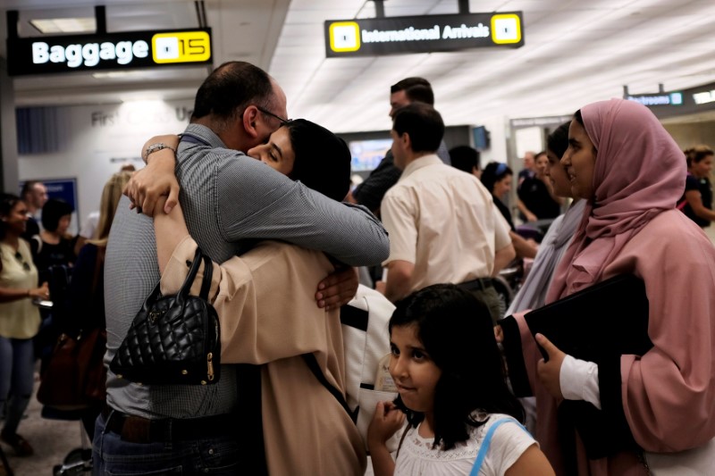 A family embraces each other as members arrive at Washington Dulles International Airport after the US Supreme Court granted parts of the Trump administration's emergency request to put its travel ban into effect later in the week pending further judicial review, in Dulles, Virginia, US, June 26, 2017. Credit: Reuters/James Lawler Duggan