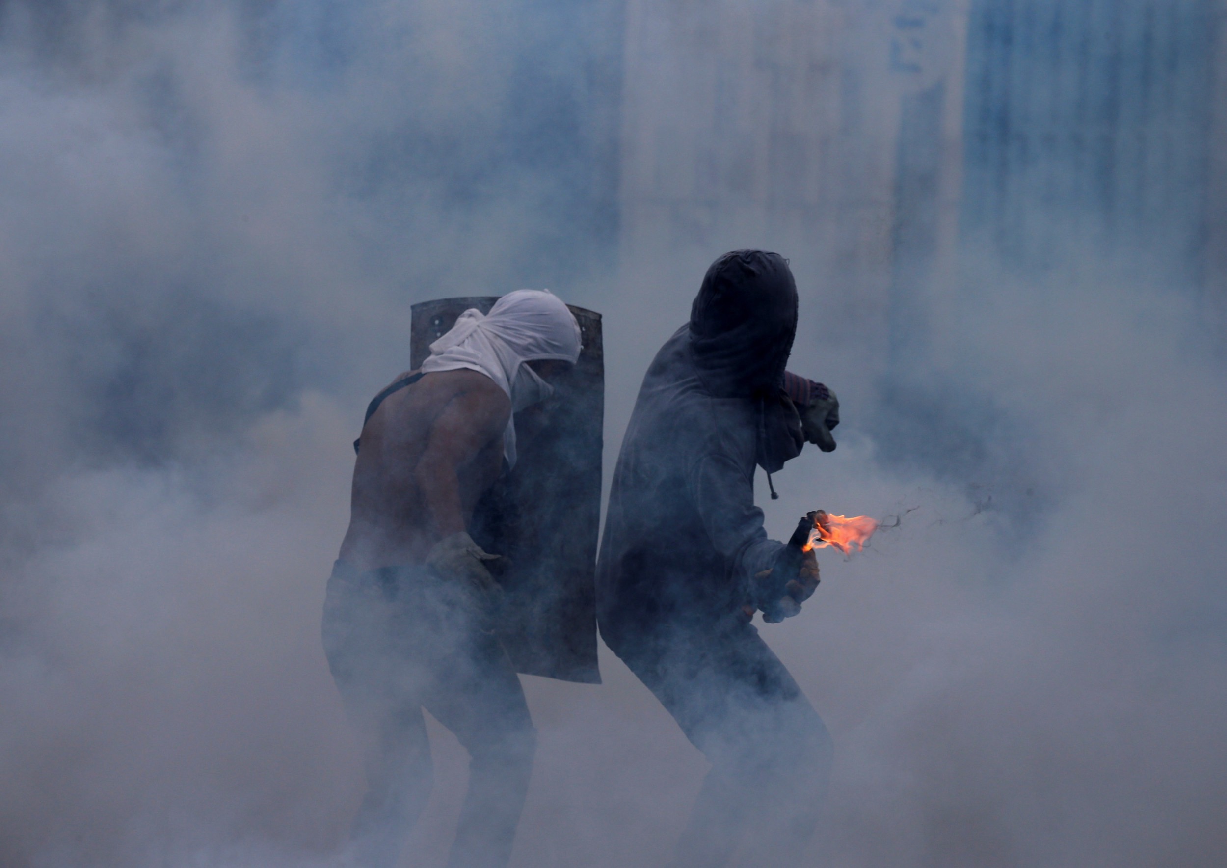 On a bridge in east Caracas, masked youths picked up tear gas canisters fired at them to hurl back at security forces or into a nearby trash-strewn river.