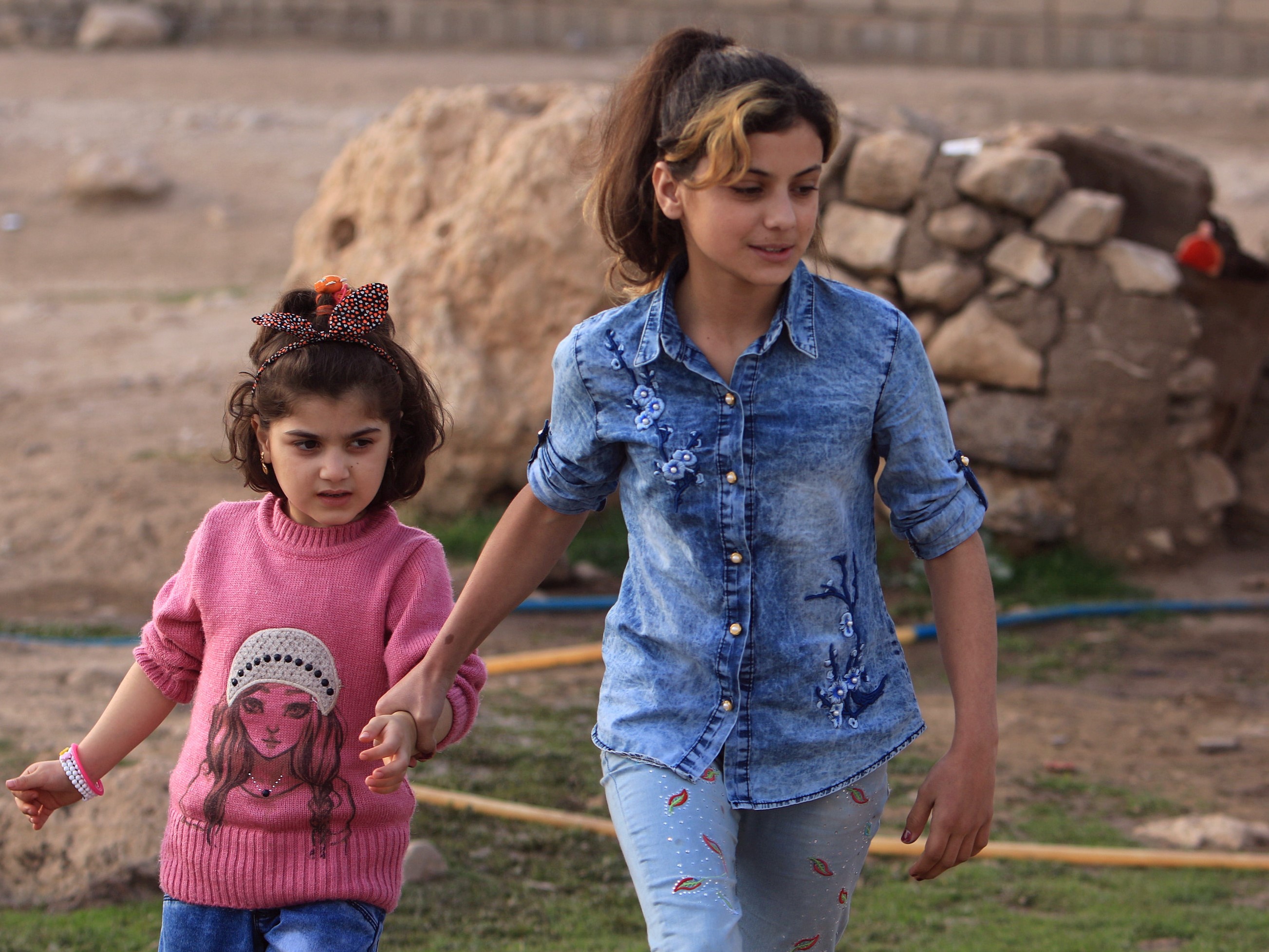 Yazidi girls Suhayla, 7, and Rosa, 13, who were reunited with their family after being enslaved by ISIS militants, walk at Sharya Camp in Duhuk, Iraq December 18, 2017. Credit: Reuters/Ari Jalal