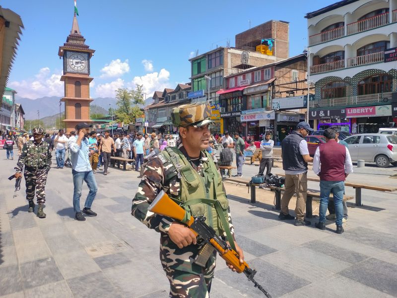 Security personnel keep vigil at the Lal Chowk, in Srinagar, Friday, April 25, 2025. Photo: PTI