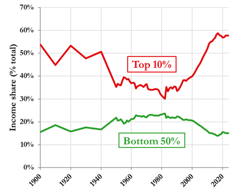 The top 10% of income earners capture about 58% of national income, while the bottom 50% receive only 15%.