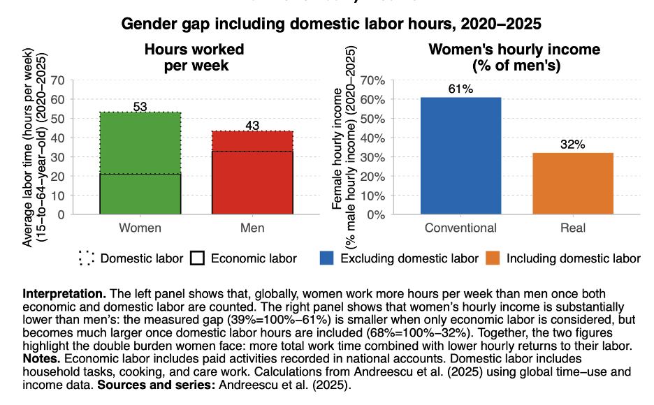 “Excluding unpaid work, women earn only 61% of men’s hourly income; when unpaid labor is included, this figure falls to just 32% [globally]. These disproportionate responsibilities restrict women’s career opportunities, limit political participation, and slow wealth accumulation,” the report states.