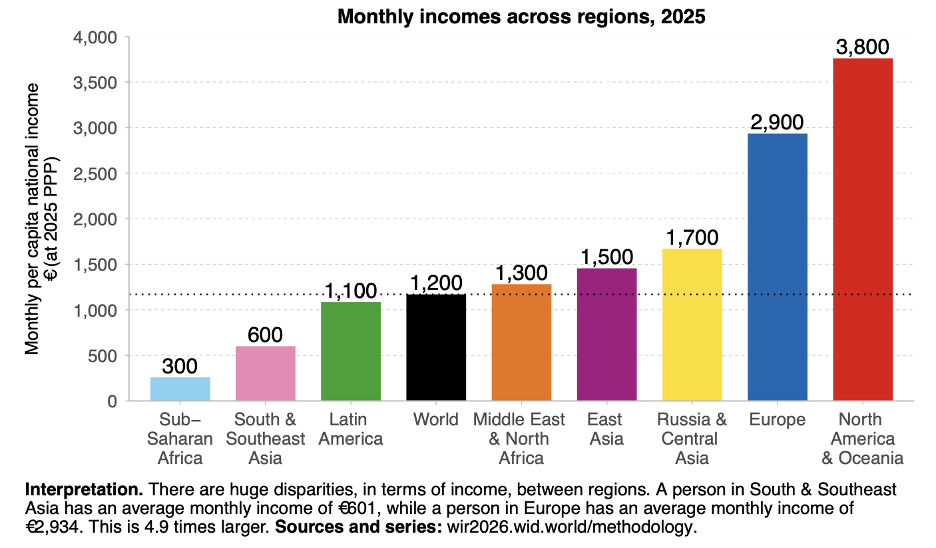 Global averages on income numbers hide the persistent regional disparities that continue to plague the world, the report notes. The “average daily income in North America & Oceania is about €125, compared to only €10 in Sub-Saharan Africa. And these are averages: within each region, many people live with far less”.