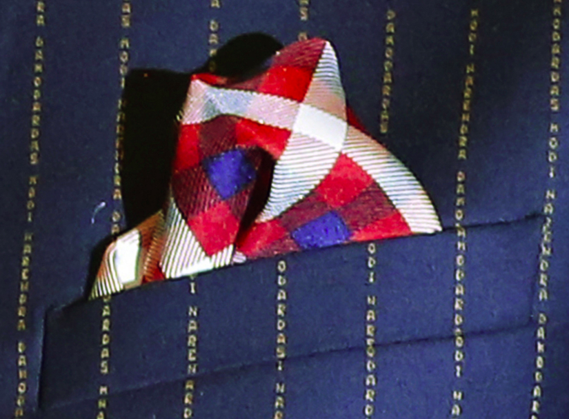 A close up photo of Modi's monogrammed suit. Photo: Reuters