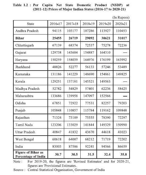 Over the years, the per capita NSDP for Bihar as a percentage of the national average has been increasing, indicating that there, indeed, has been some progress on ground zero. In 2016-17, the per capita NSDP in Bihar was at Rs 25,455 or at 30.7% of the national average, that is, Rs 83,003. Since then the ratio has climbed up steadily and in FY21, it figured at Rs 31,017 or 35.8% of the national average.