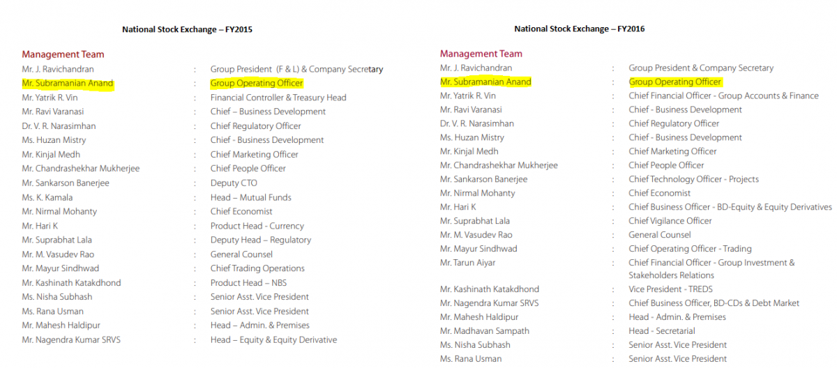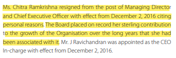 | Chitra Ramkrishna (CEO) | Chitra Ramkrishna (CEO) | Chitra Ramkrishna (CEO) | Chitra Ramkrishna (CEO) resigned 2.12.2016 |