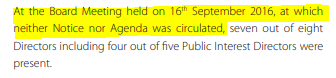 For emergency board meetings a shorter notice must be given. Yet on September 16, 2016 the NSE had a board meeting in which neither a Notice nor Agenda was circulated. One wonders how the seven out of eight directors, including four of the five public interest directors, attended the meeting without a Notice or an Agenda being circulated – did the ‘Yogi’ in distant Himalayas spiritually communicate the Notice and the Agenda to them?